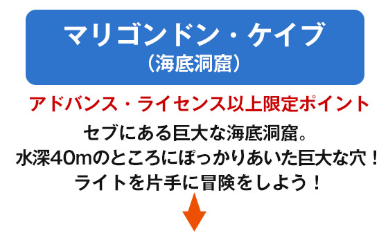 中級者以上のダイビングスポット 料金(ペソ) (ネット申込限定価格) マリゴンドン・ケイブ 1ダイブ 5,000ペソ サン・フアン(沈船)1ダイブ ※2名以上 7,800ペソ ※1名で参加する場合は15,000ペソ 追加ダイビング(他のポイント可) 2,500ペソ 料金(ペソ) BCD・レギュレーター・ウェイト 1日 900ペソ フルセット 1日 1,300ペソ ダイブコンピュータ 500ペソ ウエットスーツのみ 300ペソ ウエイトのみ ウエイト一つにつき40ペソ, ベルトは80ペソ 水中カメラ 1日 900ペソ