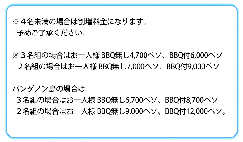 ※島に上陸する場合は入島料がお一人様300ペソが別途かかります。